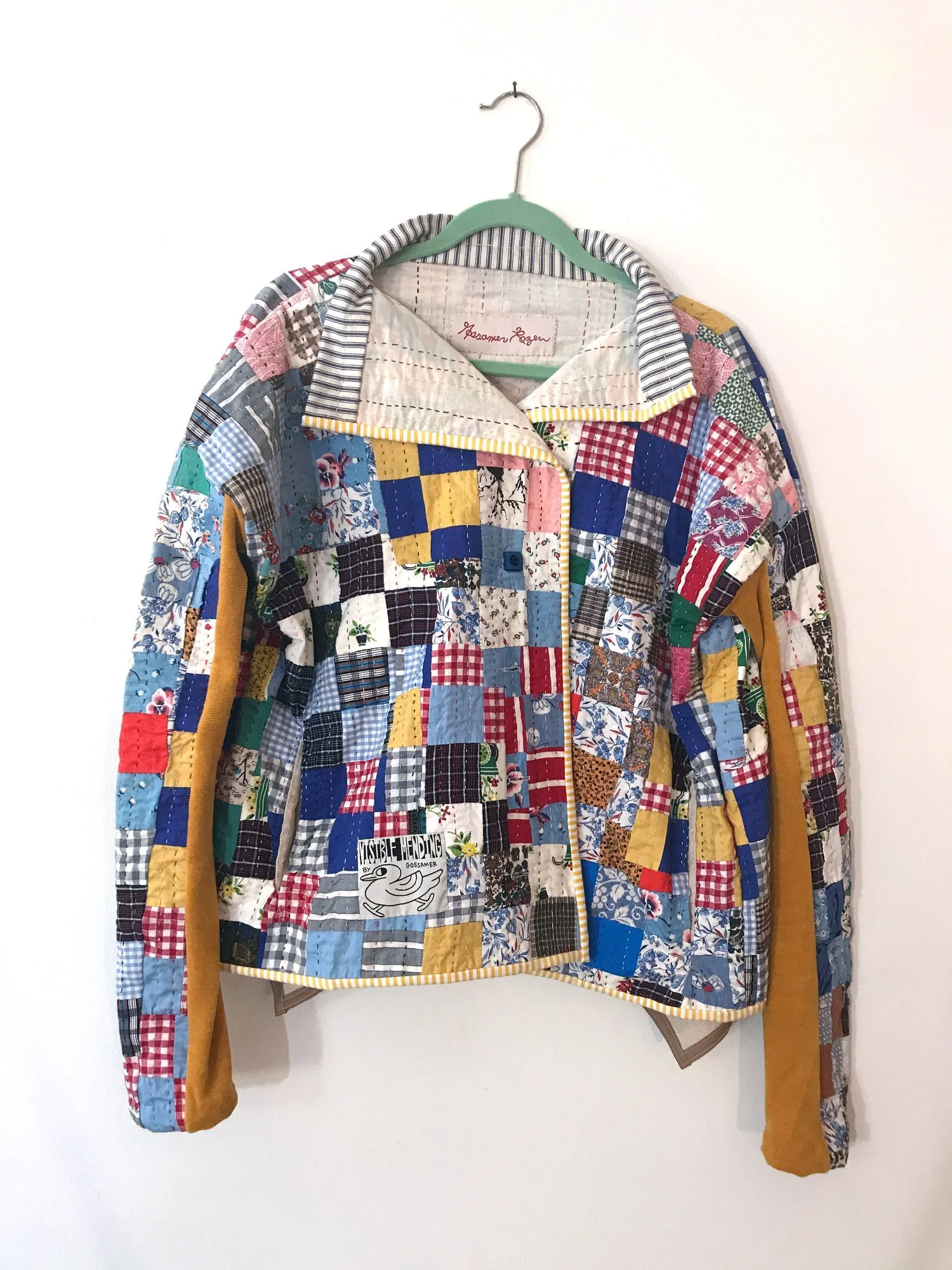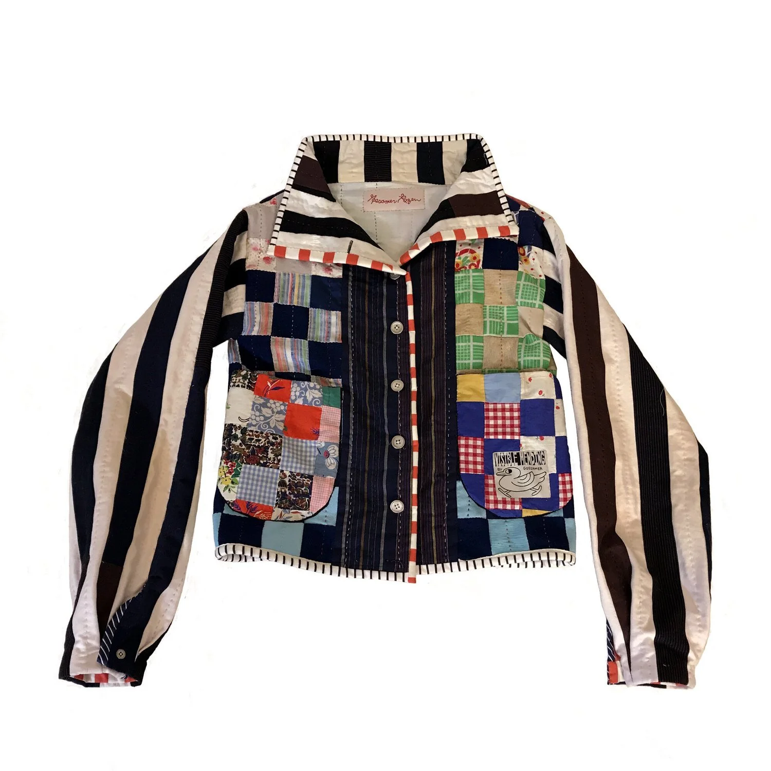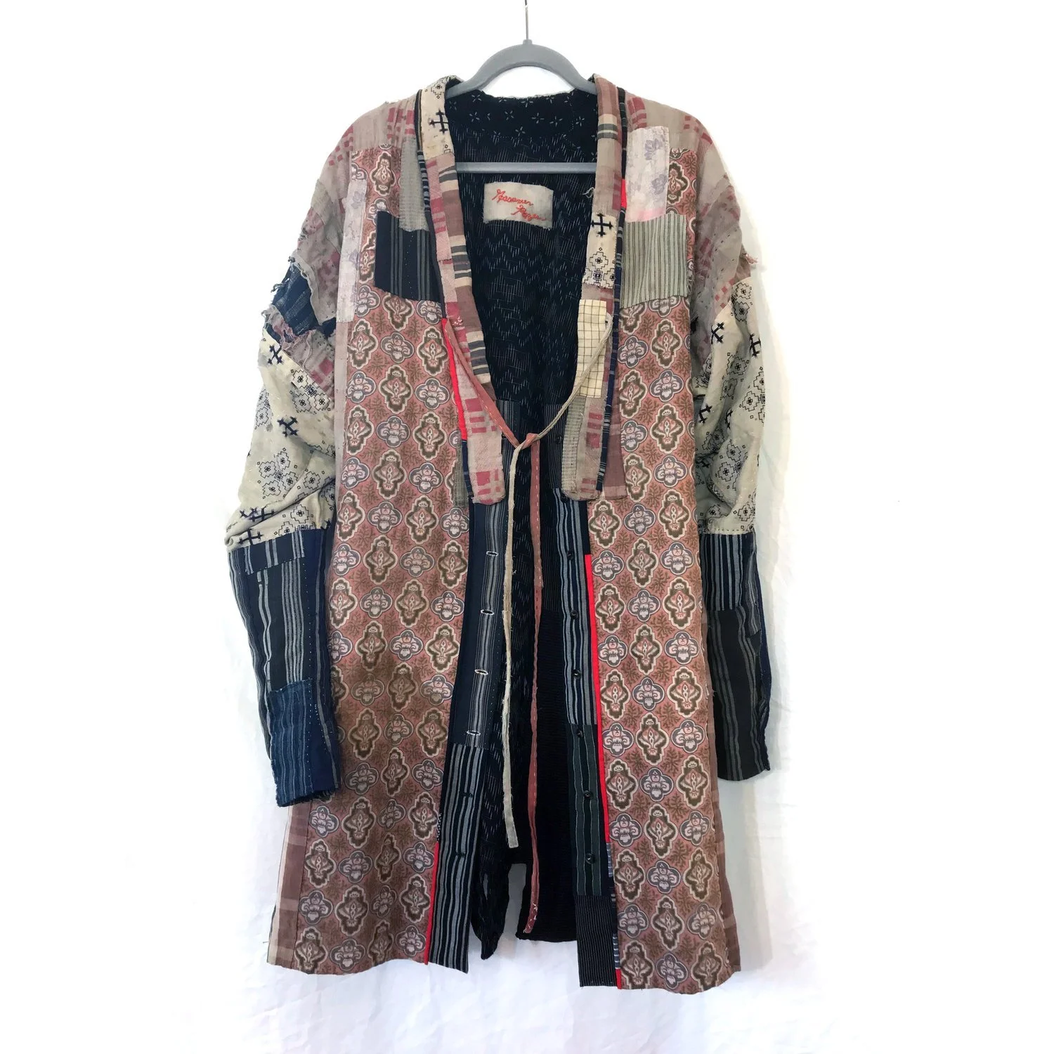 I started hand-piecing and hand-quilting a garment from vintage Japanese fabric as early as 2015. The unfinished project became a sketch book for aesthetic, material, and process. The logo for Gossamer Rozen was derived from the hand-stitched tag on this piece.