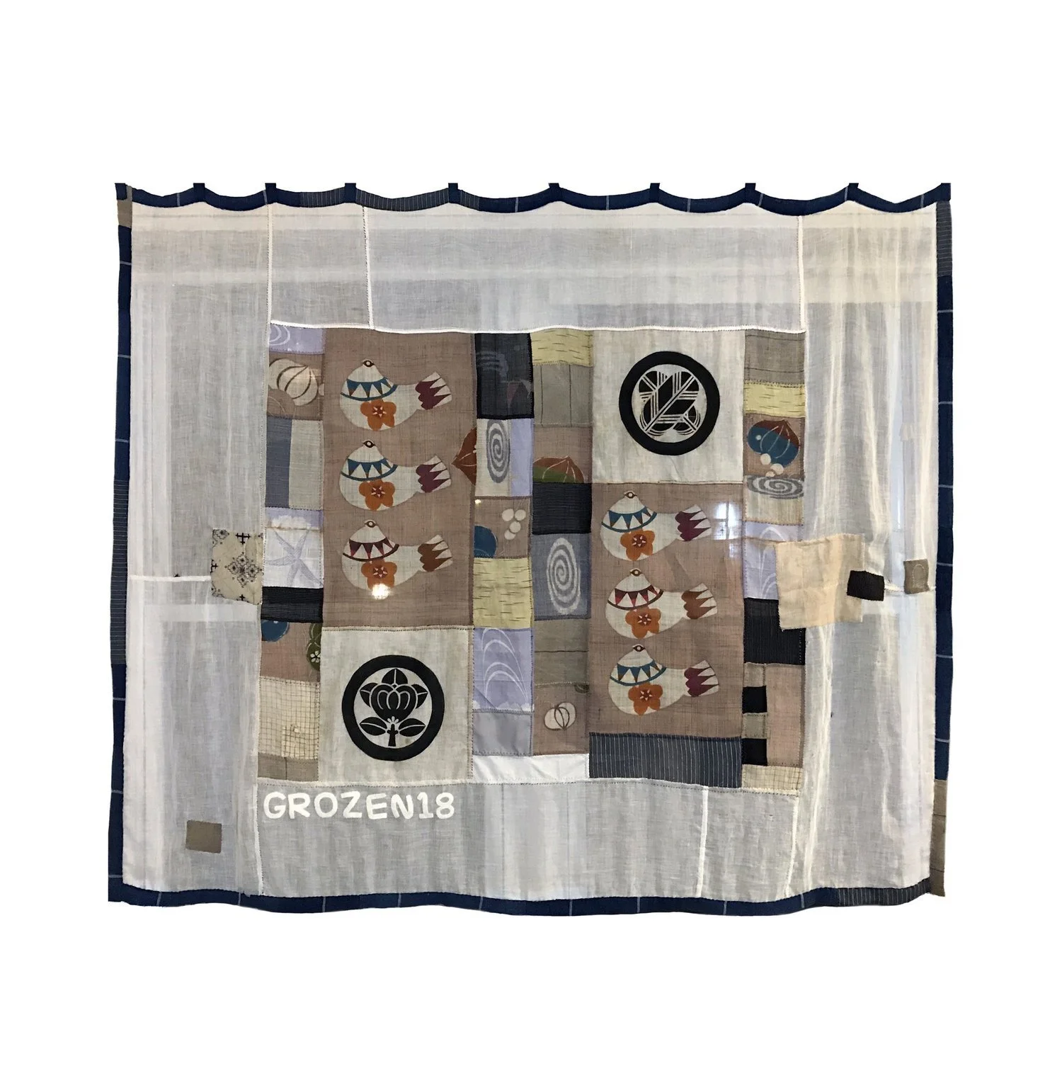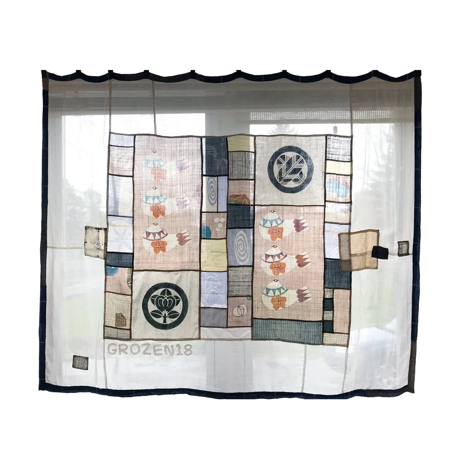 I designed and created two curtains from Japanese textiles. The pieces are inspired by patchwork Korean bojagi techniques and stained glass. I was interested in creating a patched piece of fabric finished on both sides, where seams become line work like lead piping in stained glass. I was interested in the translucency created by the variety of different textiles and its dual look during night or day.