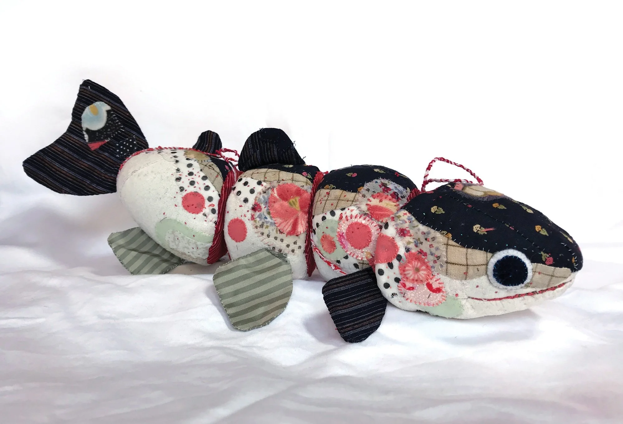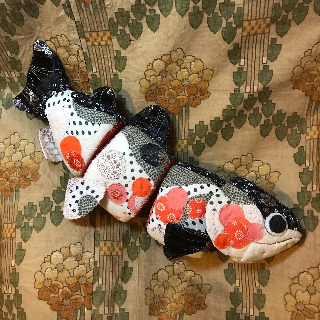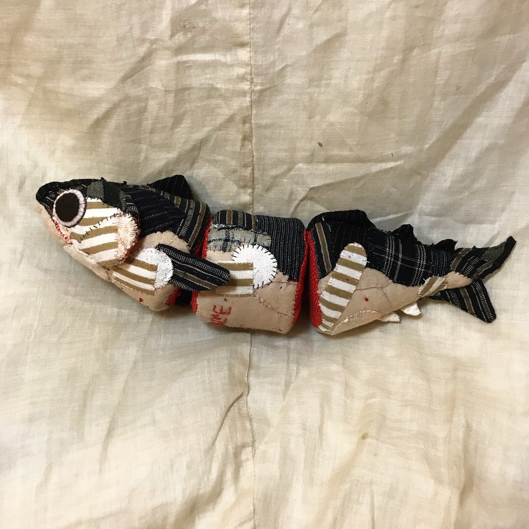These hand stitched fish were created from 2014-2019. I have been fascinated by the way fish glimmer in the water from above as a child, growing up visiting a trout hatchery and fishing with my parents. I wanted to recreate the feeling of these animals with cloth. Construction is inspired by cloisonne articulated fish and puppetry.
